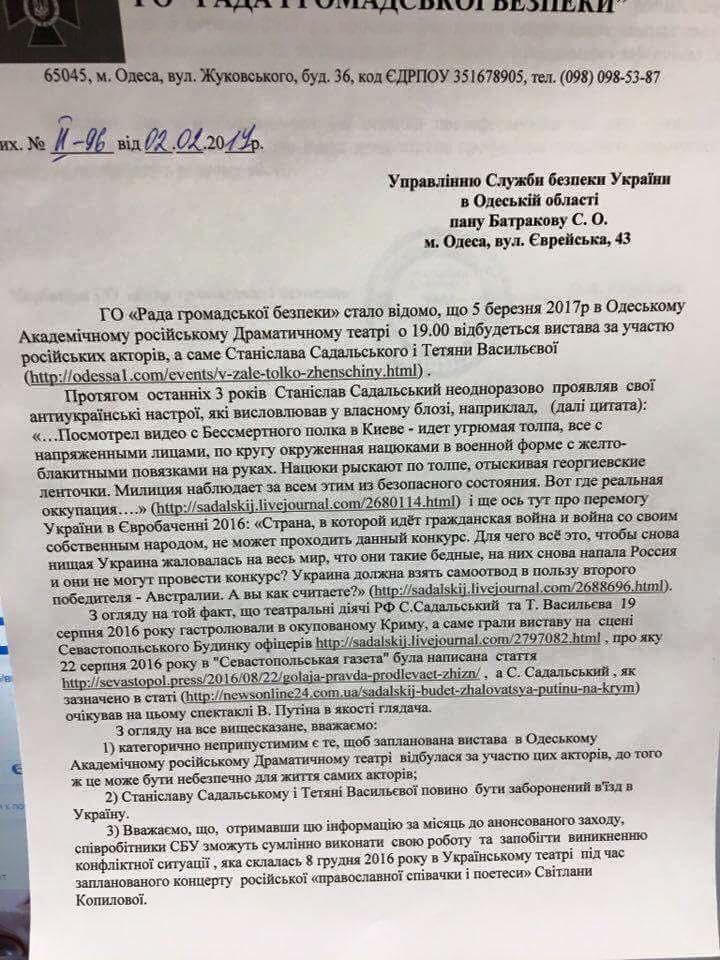 В качестве доказательства актер опубликовал обращение одесской общественной организации "Рада громадської безпеки" в региональное управление Службы безопасности Украины (СБУ).