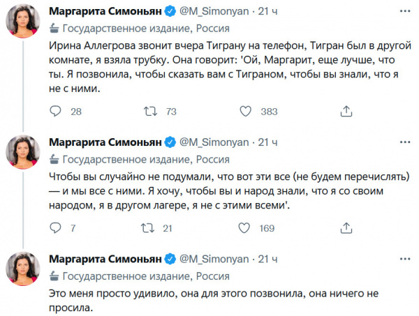 Аллегрова сама позвонила сказать, что она не с ними. Чтобы они случайно не подумали, что вот эти все (не будем перечислять) - и они все с ними. С этими. Она просто хочет, чтобы они и народ знали, что она со своим народом. В другом лагере. Она не со всеми этими.