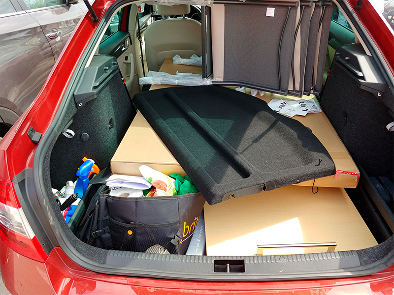Приз за "Самый вместительный седан" (ну, точнее, лифтбэк) получает автомобиль "Шкода Октавия" модели 2017 года. Что в её салон влезет большой стол для улицы и четыре стула - я не верил до самой последней минуты. 80 евро сэкономили, с нас за доставку из Матаро в Калейю 80 евро хотели слупить при цене всего комплекта стол плюс четыре стула в €109. Жаба душила страшно. Но "Октавия" оказалась на высоте. (Стол со стульями ухватили по спецпредложению, это было только в данном Brico Depot. На кассе сначала выскочила цена €500, мы спросили, что за фигня такая, ткнули им их же брошюрку со спецпредложениями - после этого исправили цену.)