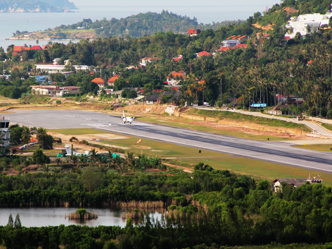 Забрались на холм, откуда хорошо виден остров и единственная посадочная полоса местного аэропорта. Вот такой там вид.