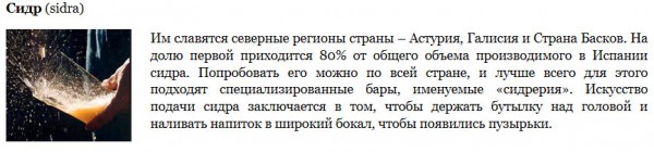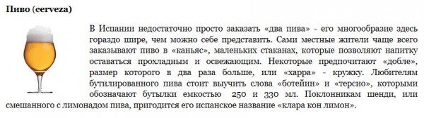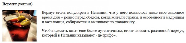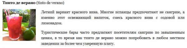 Кстати, ну ладно сангрия. Но среди популярных напитков упомянуть пиво и не упомянуть обычное вино, которое, безусловно, первое по популярности наравне с пивом - это надо уметь. Так что хорошая статья. Познавательная.