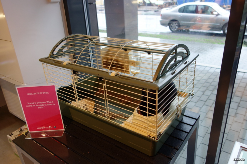 А это талисман отеля - кролик Пинки. Раньше его держали в кабинете директора, но кролику там было скучно, поэтому его теперь определили в ресепшн.