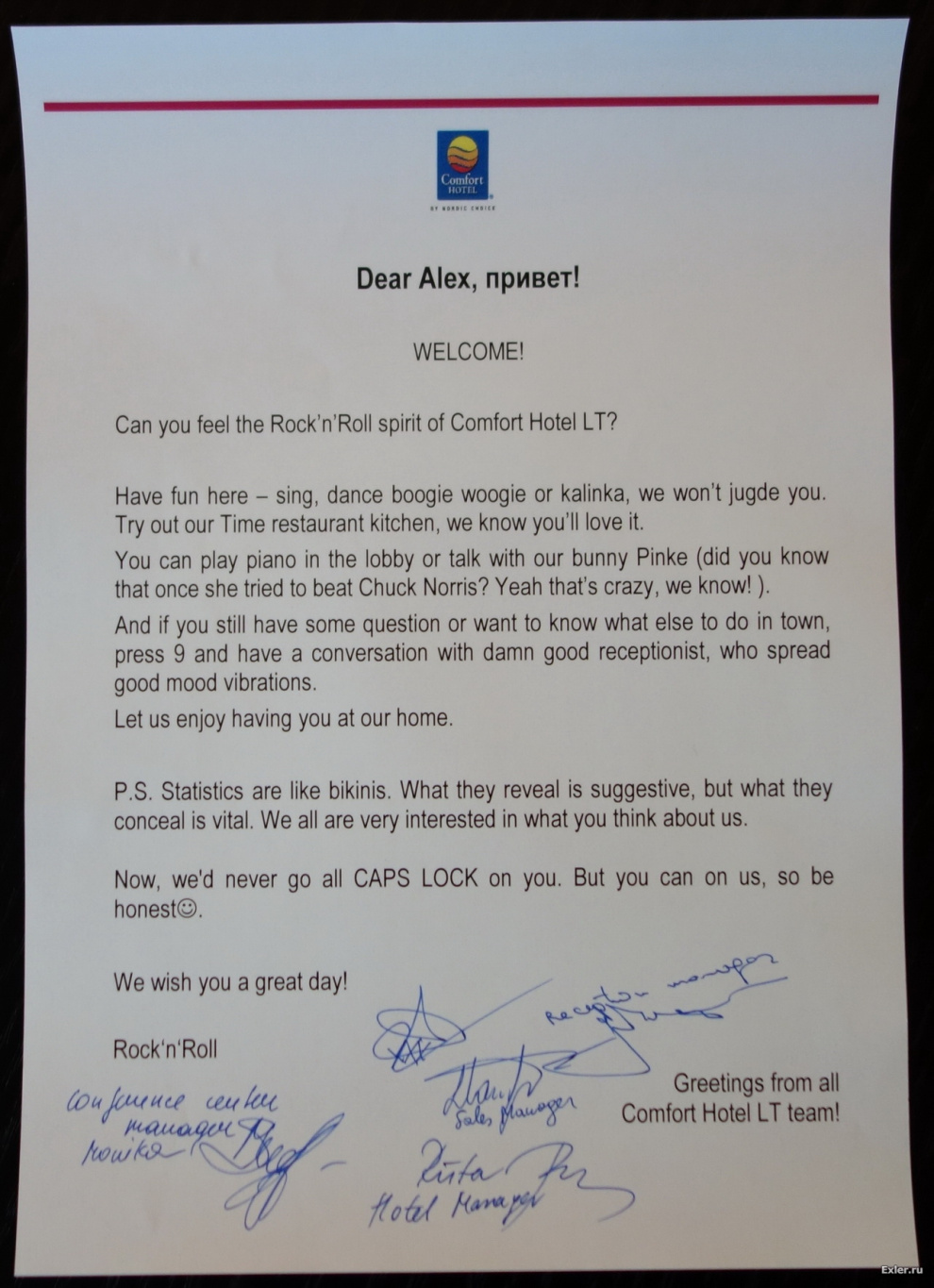 На столе лежало приветствие клиенту от персонала. Ну, обычная система в хороших отелях: вас приветствуют и надеются, что вы хорошо проведете время. Но вот прочитайте это приветствие - по-моему, просто класс!