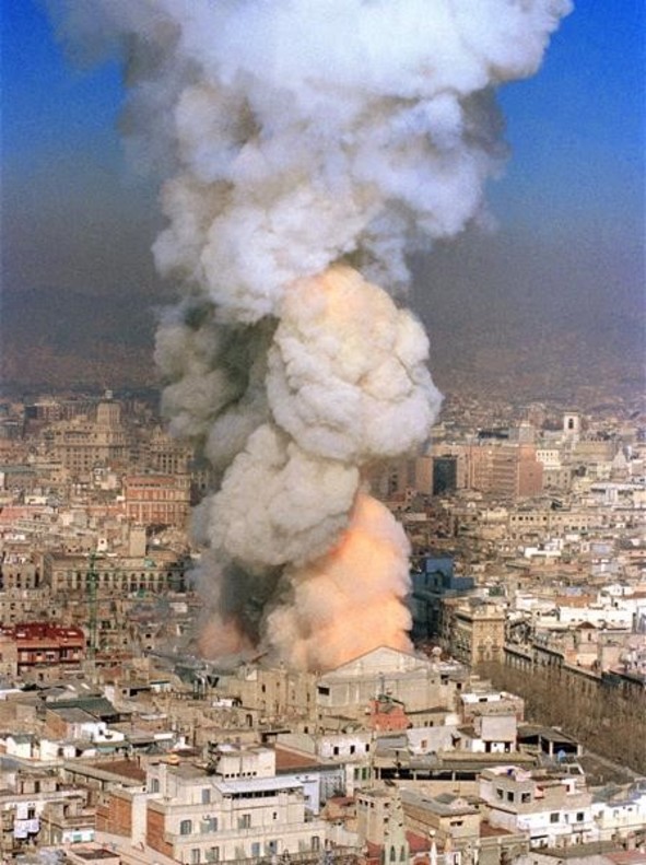 31 января 1994 года театр снова сгорел - вот фотография пожара из El Periódico. (Яна рассказывала, что она лично видела этот пожар - тогда к зданию сбежалось много барселонцев.)
