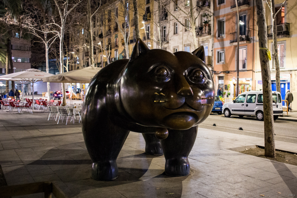 Ну и главная достопримечательность бульвара - Эль Гато, здоровенный котище, творение колумбийца Фернандо Ботеро. В Терминале 2 аэропорта Барселоны установлен Конь творения Ботеро, а Кот жил и в парке Цитатель, и рядом с Олимпийским стадионом на Монжуике, и на маленькой площади за судостроительными верфями, пока его не водрузили здесь, в Равале.