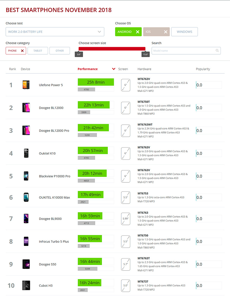 Я еще удивился, когда uleFone на первом месте увидел - у меня как раз на тесте только что был uleFone Armor 5, который со своим аккумулятором в 5000 мАч автономность демонстрировал очень скромную (но он на самом деле в остальном очень даже хорош - обзор будет, может быть, прямо завтра), а потом посмотрел на этот uleFone Power 5 - так у него аккумулятор на 13000 мАч, такая здоровенная бандура!