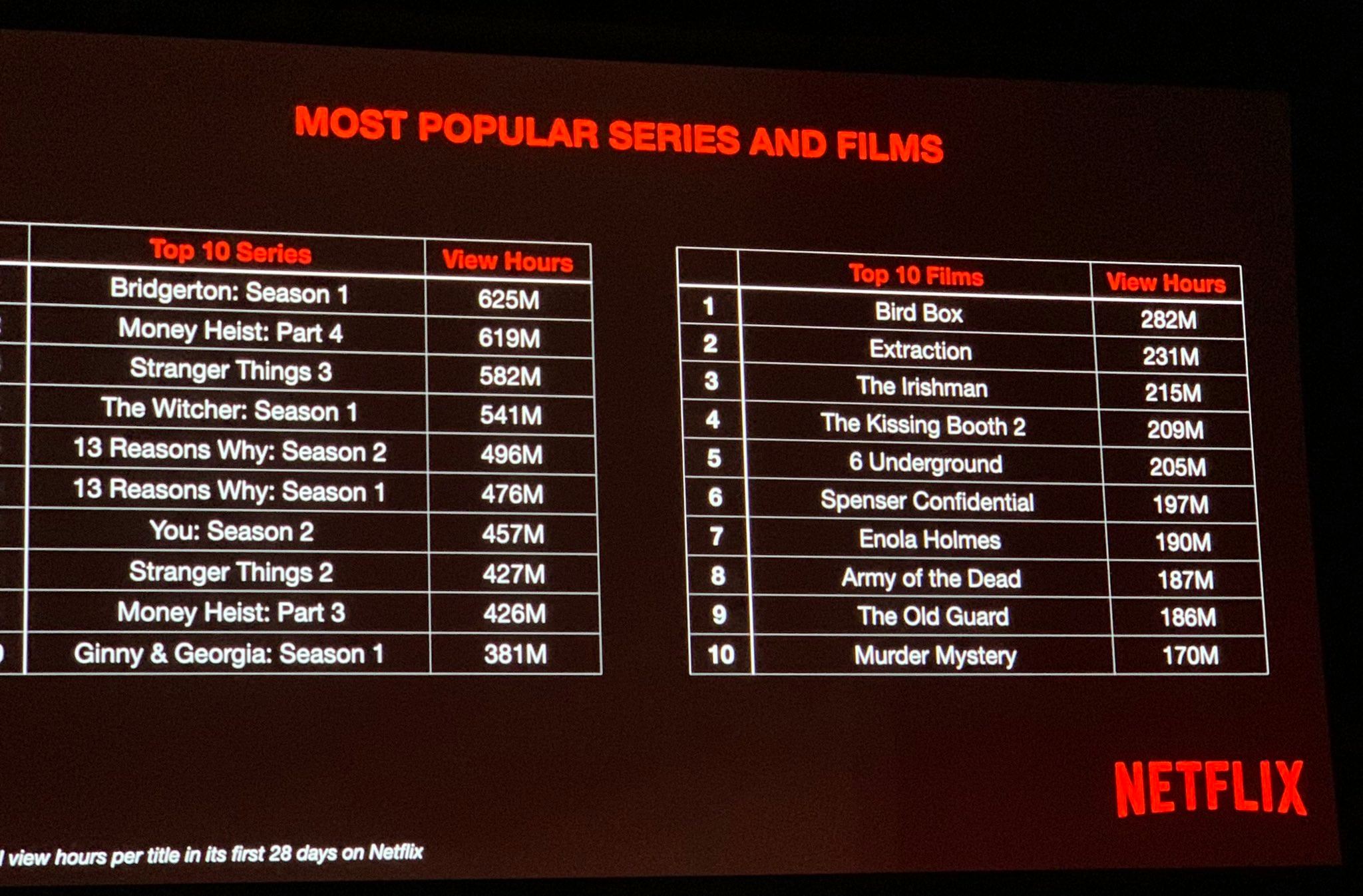 Netflix опубликовал Top 10 самых популярных сериалов (точнее, сезонов сериалов) и фильмов, причем с цифрами просмотра (у Малинина увидел). Очень интересно было ознакомиться. Ну и цифры просмотров, конечно, впечатляют - от 170 до 625 миллионов.