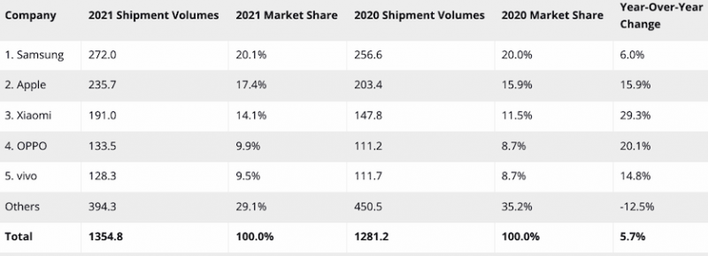 По версии IDC, первое место в 2021-м заняла Samsung, отгрузившая за отчётный период 272 миллиона смартфонов (271 млн по данным Counterpoint). Вторую строчку занимает Apple с показателем в 235,7 миллиона (237,9 млн) гаджетов. Замкнули топ-5 компании Xiaomi, OPPO и vivo, поставившие 191 (190 млн), 133,5 (143,2 млн) и 128,3 (131,3) миллиона устройств соответственно.