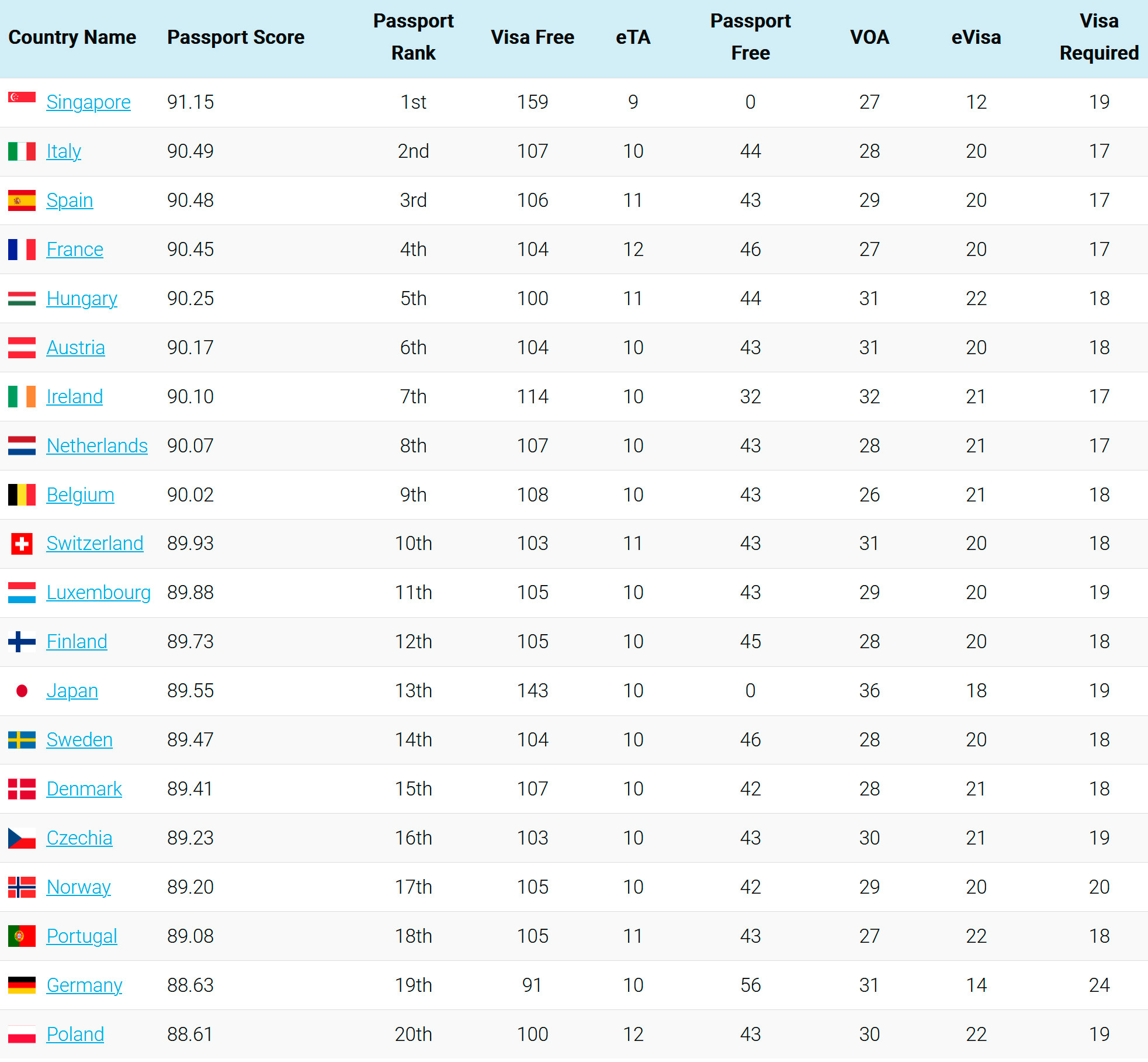 По данным обновленного рейтинга, сингапурский паспорт является самым сильным паспортом в мире, имея 91,15 балла по состоянию на июнь 2024 года. За ним следуют итальянский, испанский, французский и венгерский паспорта соответственно, завершая пятерку самых сильных паспортов на 2024 год.
