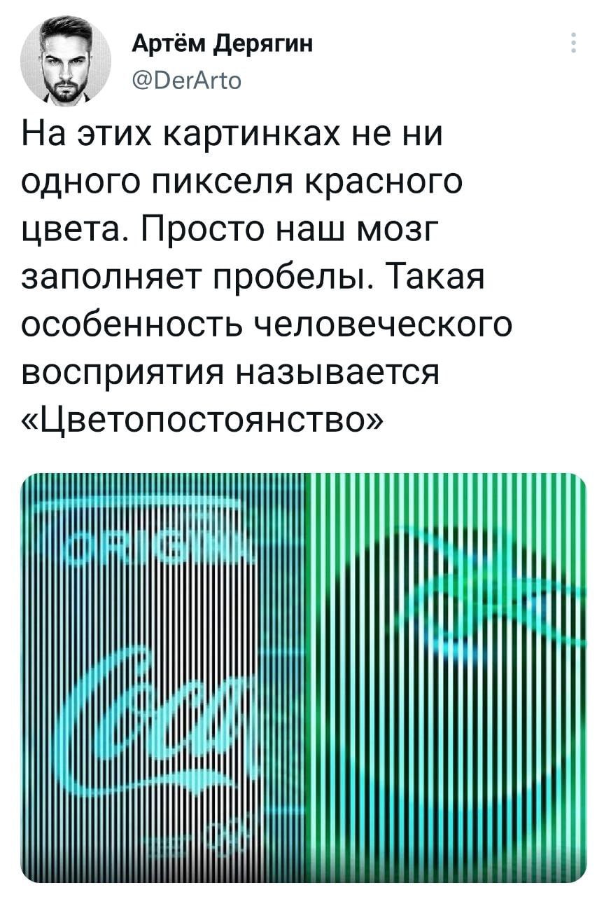 Если картинку с помидором (выше) приблизить настолько, чтобы зеленые полосы стали восприниматься как отдельные объекты, а не как общее мельтешение, иллюзия красного тоже исчезает.