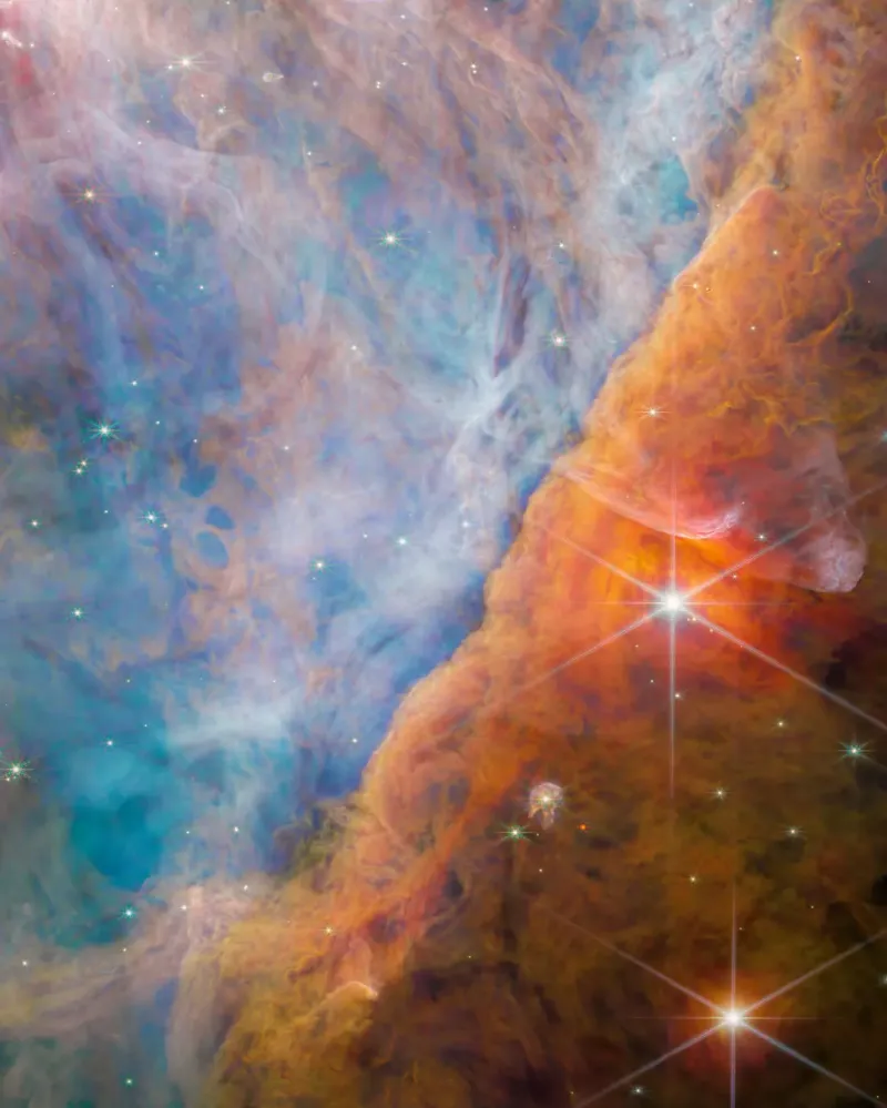 Чуть ниже пояса Ориона находится один из самых знаменитых объектов ночного неба - туманность Ориона, звездный питомник, в котором обитает около 700 молодых звезд. На этом снимке телескопа внимание сосредоточено не на всей туманности, а на структуре в левом нижнем квадранте, известной как Бар Ориона. (ESA/Webb, NASA, CSA, М. Замани (ESA/Webb) и команда ERS PDRs4All)