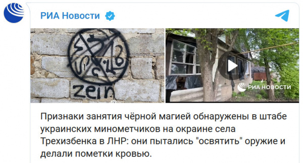 ТРЕХИЗБЕНКА (ЛНР), 4 мая — РИА Новости. Признаки занятия черной магией обнаружены в штабе украинских минометчиков на окраине села Трехизбенка: адепты потусторонних сил пытались "освятить" оружие и делали пометки кровью, передает корреспондент РИА Новости.