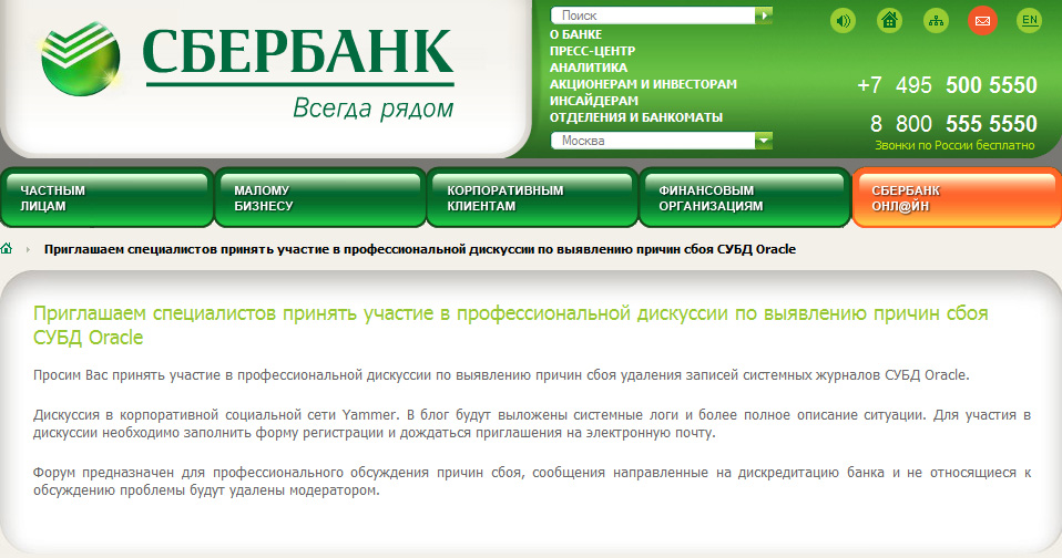 Так что если вы профессионал, ну или же просто увлекаетесь "Ораклом" в свободное от оперного пения время, обязательно примите участие в профессиональной дискуссии по выявлению причин сбоев в базах крупнейшего банка страны. Это очень демократично и крайне секьюрно, мои комплименты, дорогой "Сбербанк". Лишний раз говорю сам себе "спасибо" за то, что не являюсь твоим клиентом.