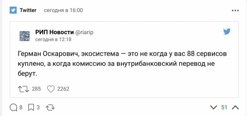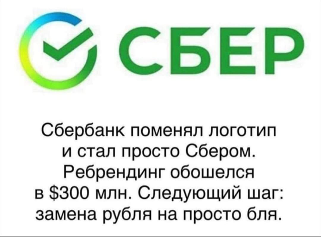 Все уже насладились так называемой онлайн-конференцией Сбербанка? Ну, переименование "Сбербанка" просто в "Сбер" за 2,5 миллиарда - это уже красиво. Но как-то неровно. Оттяпать четыре буквы должно стоить для ровного счета 4 миллиарда - по ярду за букву. Следующим логичным решением будет ребрендинг рубля - там первые две буквы нужно оттяпать, чтобы получилось то, что нужно.