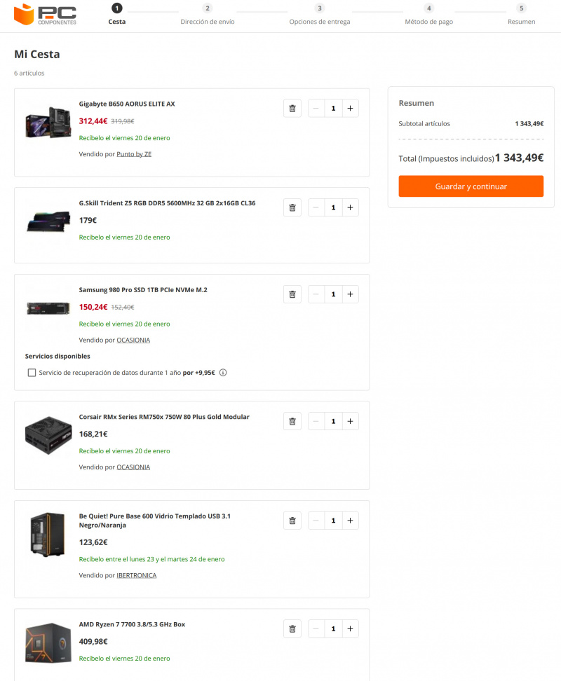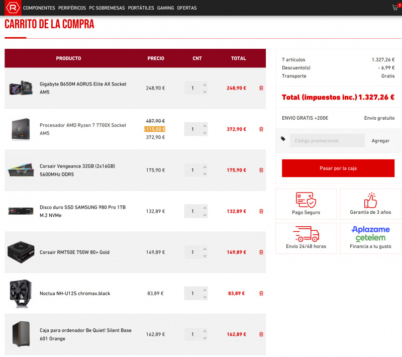 Однако теперь переходим в чисто практическую плоскость. Попробовал собрать эти комплектующие на PCComponents (один из самых крупных компьютерных магазинов в Испании).