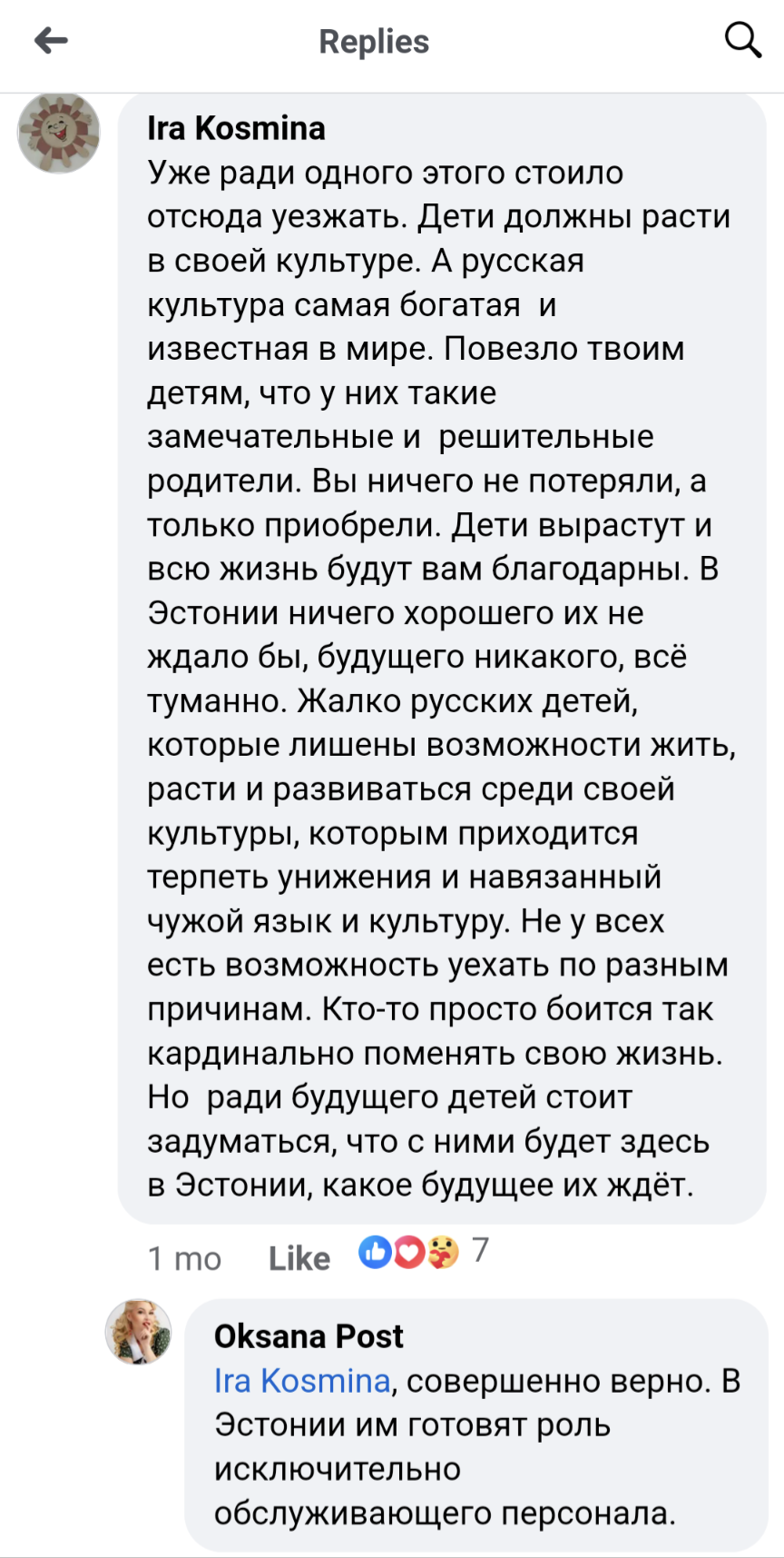 Ну и вишенкой на торте, особенно доставило "В следующем году дети Пост «попадали под этот каток», то есть им предстояло начать учиться в Эстонии на эстонском языке. Ввиду такой ОПАСНОСТИ (!!!) было принято решение не медлить и увозить детей в Россию. "