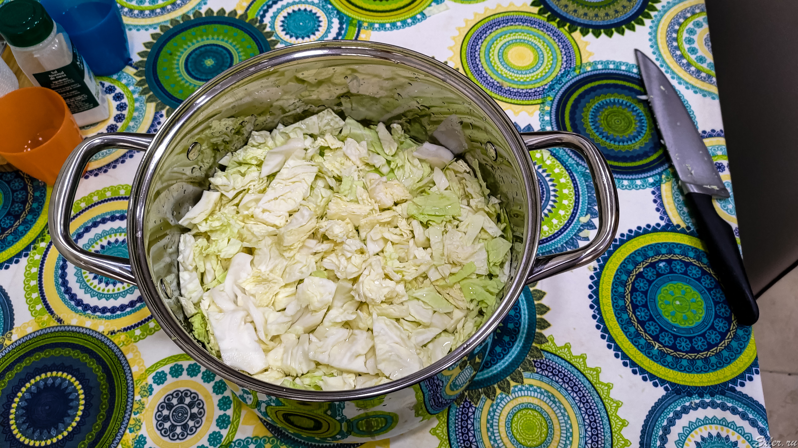 Ну а теперь - рецепт. У нас есть полтора кочана данной правильной капусты. (Вообще-то два, но половину отдали жене для супа.) Общий вес полученного чистого продукта - порядка двух килограммов.
