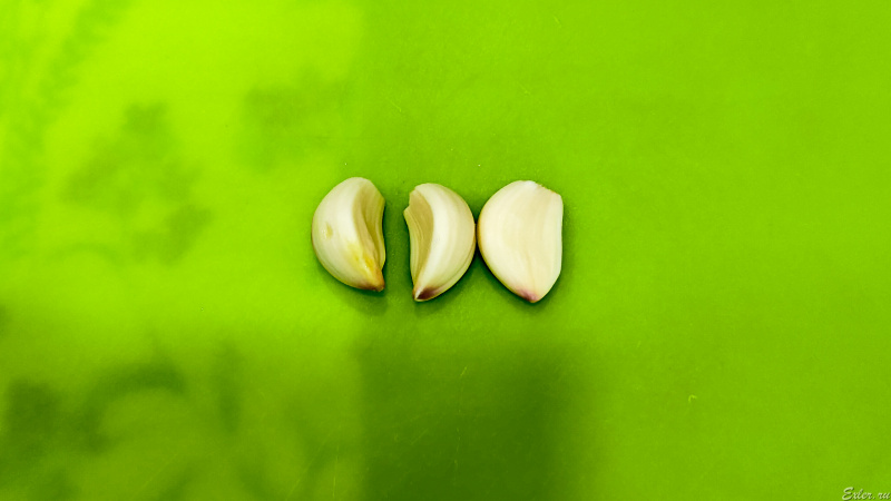 Далее по рецепту берутся три дольки чеснока и мелко-мелко рубятся.