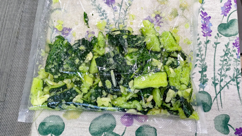 Теперь огурцы с чесноком нужно положить в плотный пакет для вакуумирования (или в два обычных пакета) и как следует их поколотить, чтобы они пустили сок.