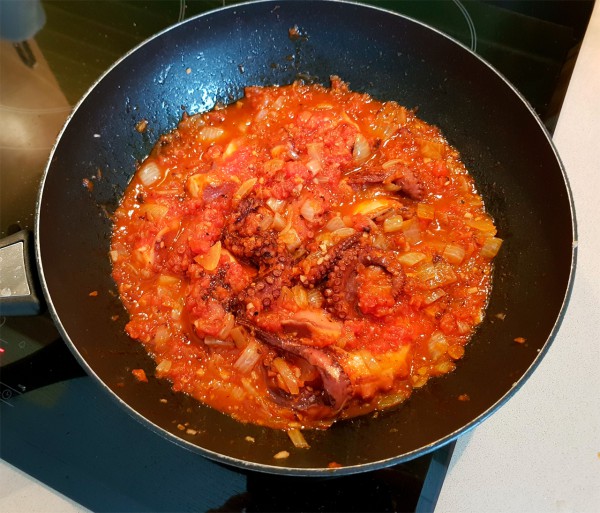 Когда осьминог и лук обжарятся (обычно это занимает минут десять), осьминог солится, перчится черным и красным перцем, для остроты можно добавить чуть-чуть кайенского перца, после чего туда кидается пара давленных долек чеснока, вливаются томаты (или томатная паста), хорошенько перемешивается и ставится под крышку на маленький огонь на 20-30 минут.