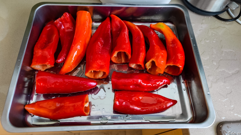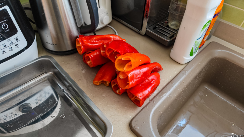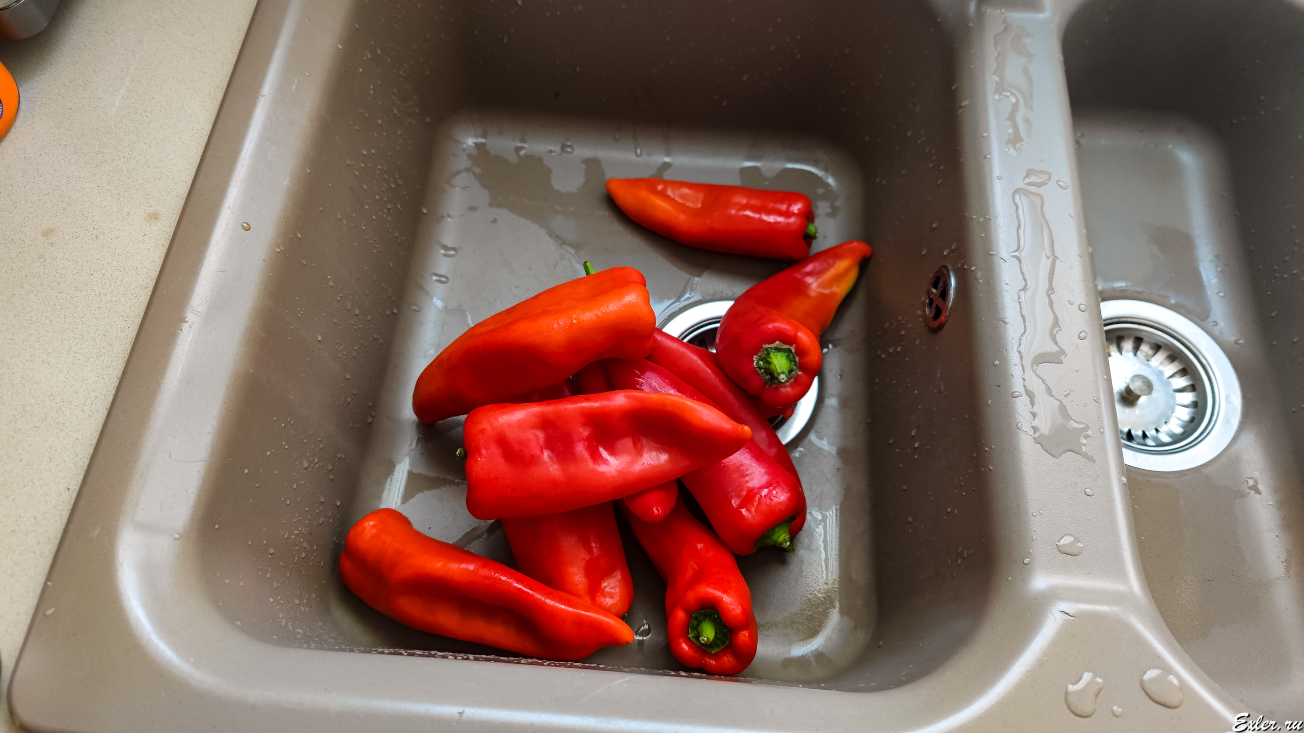Для приготовления блюда нам понадобится несколько сладких перцев - лучше всего красных. Можно использовать вытянутые красные (лучше всего - итальянские), можно более крупные и мясистые. С зелеными перцами мы это блюдо делали: получилось терпимо, но и только-то. А вот с красными такого сорта - вообще отлично.