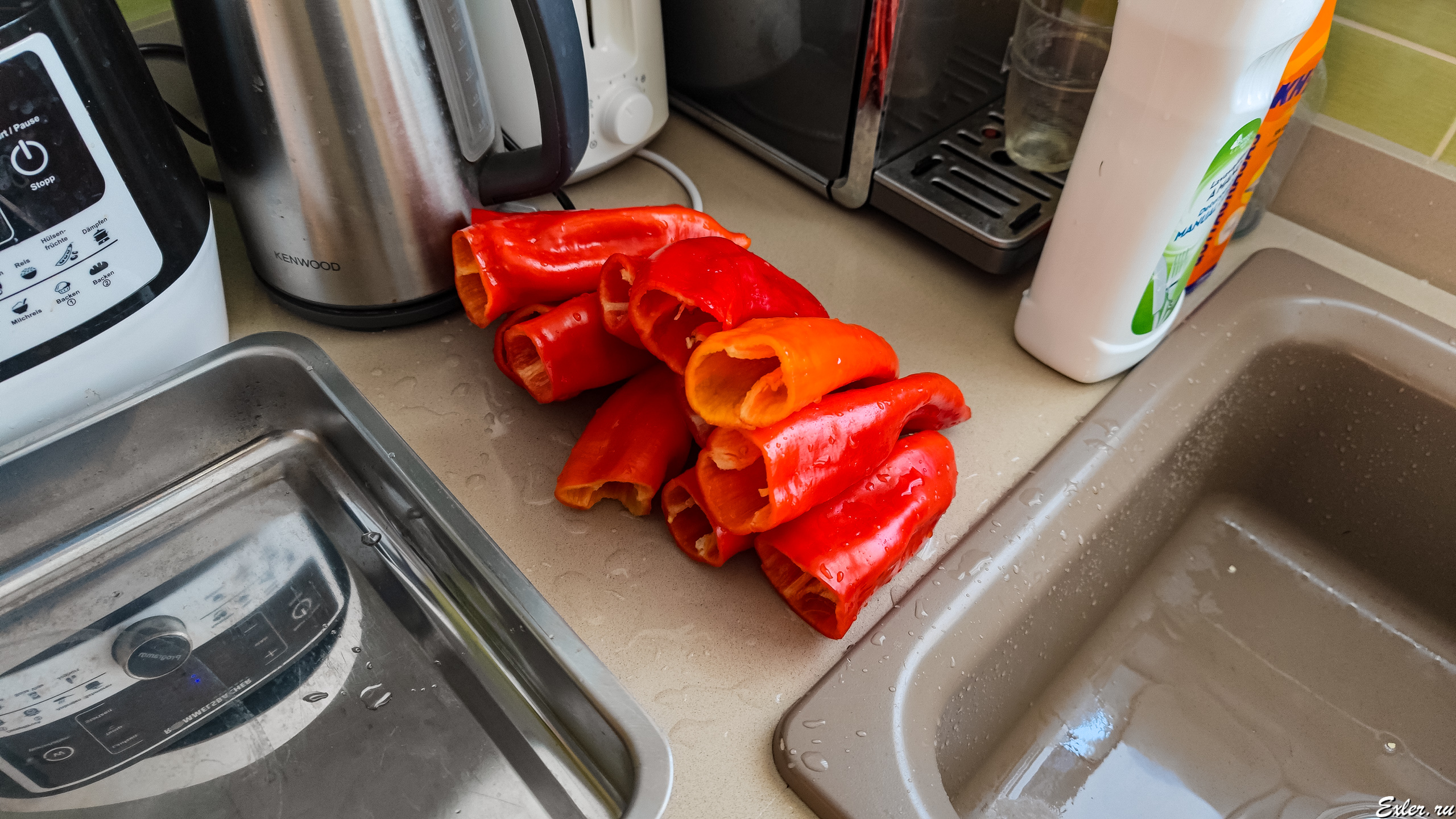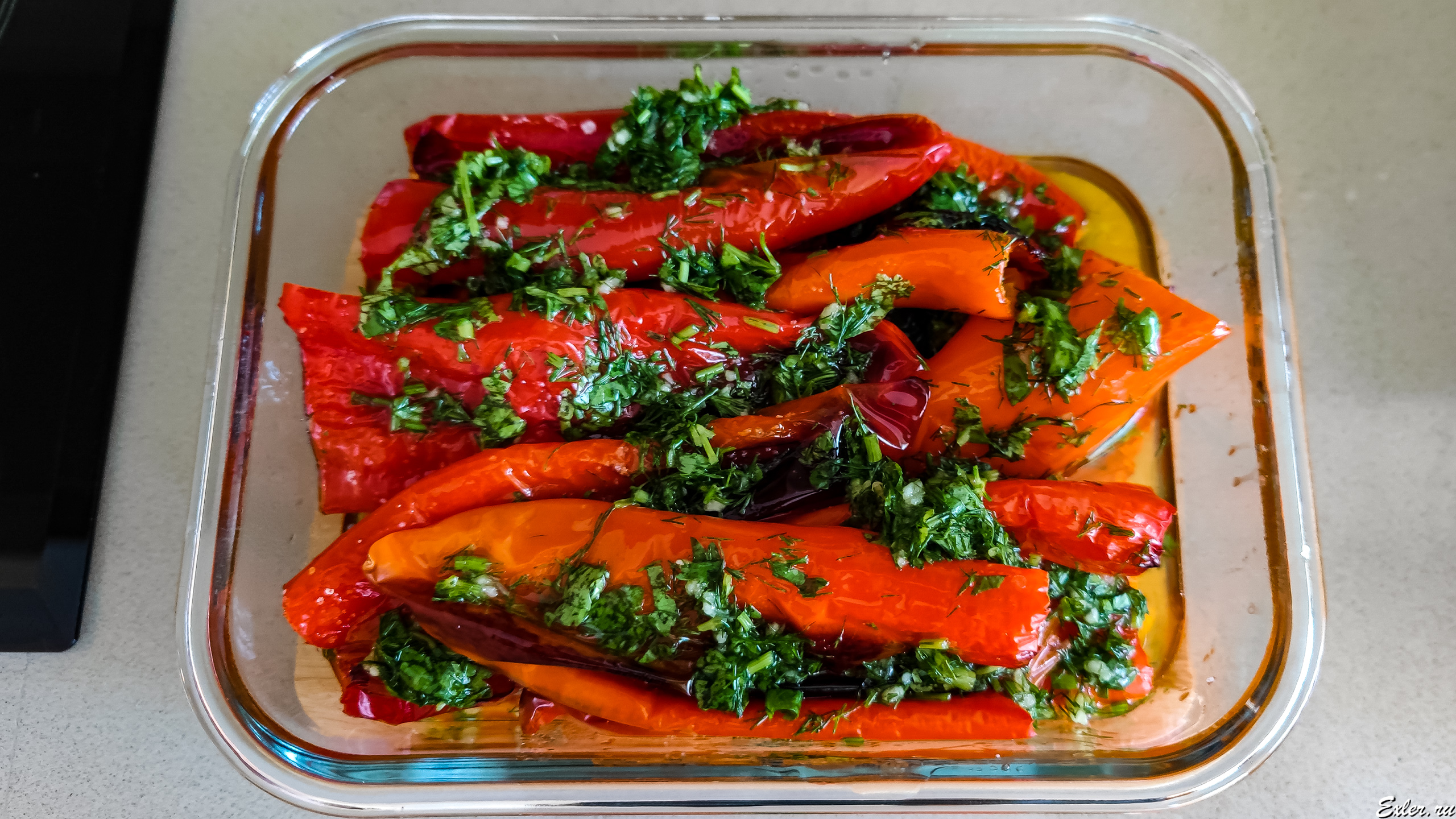 Теперь берем контейнер (лучше всего стеклянный, чтобы проще было мыть), укладываем слой перцев, поливаем их соусом, после чего укладываем следующий слой перцев и снова поливаем.