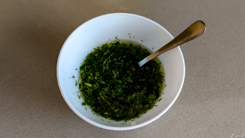 В плошке готовим нехитрый соус: оливкового масла примерно 2/3 стакана, туда мелко режем укроп и петрушку (кинзу), выдавливаем через пресс пару зубчиков чеснока, перчим, как следует всё перемешиваем.