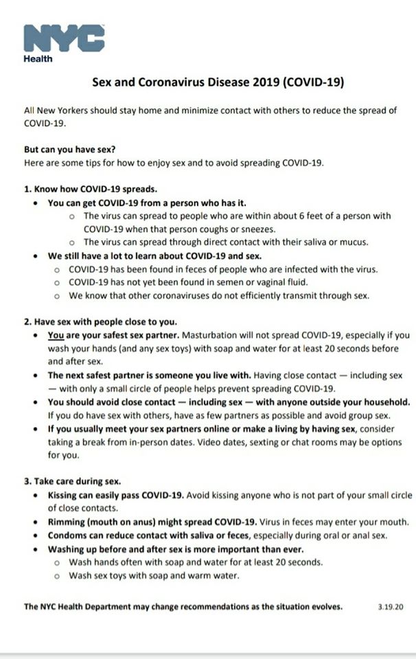 • Вы – ваш самый безопасный секс-партнер. Covid-19 не передается при мастурбации, особенно если вы помоете руки (и используемые секс-игрушки) в воде с мылом, по крайней мере, в течение 20 секунд, причем как до, так и после секса