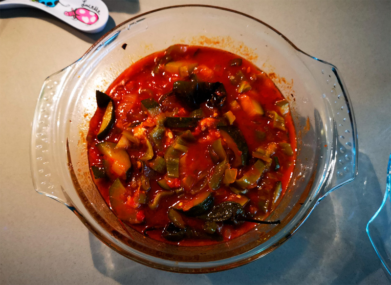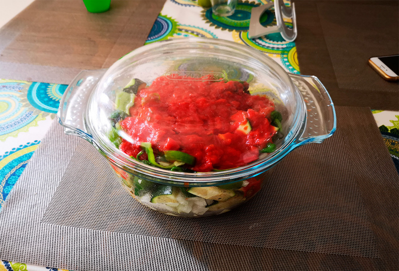 Берем один кабачок (или цуккини) средних размеров, луковицу, пяток зеленых длинных перцев (в России для этой цели отлично подойдут болгарские перцы любых цветов). Все это мелко режем и кидаем в стеклянную огнеупорную кастрюльку для духовки. Для остроты я добавляю еще упаковку маленьких зеленых перчиков, которые туда кидаются целиком, но без них можно обойтись. Делаем заправку из оливкового масла, соли, перца и провансальских травок, добавляем в кастрюльку, перемешиваем. Далее сверху выливаем банку мелко растертых помидоров. Если мелко растертых помидоров дома нет, то можно просто мелко порезать четыре-пять штук обычных помидоров.