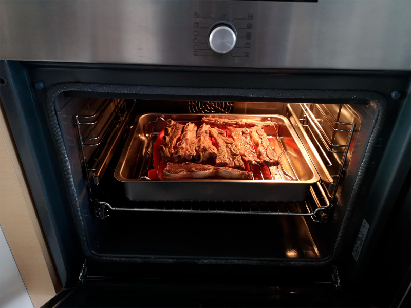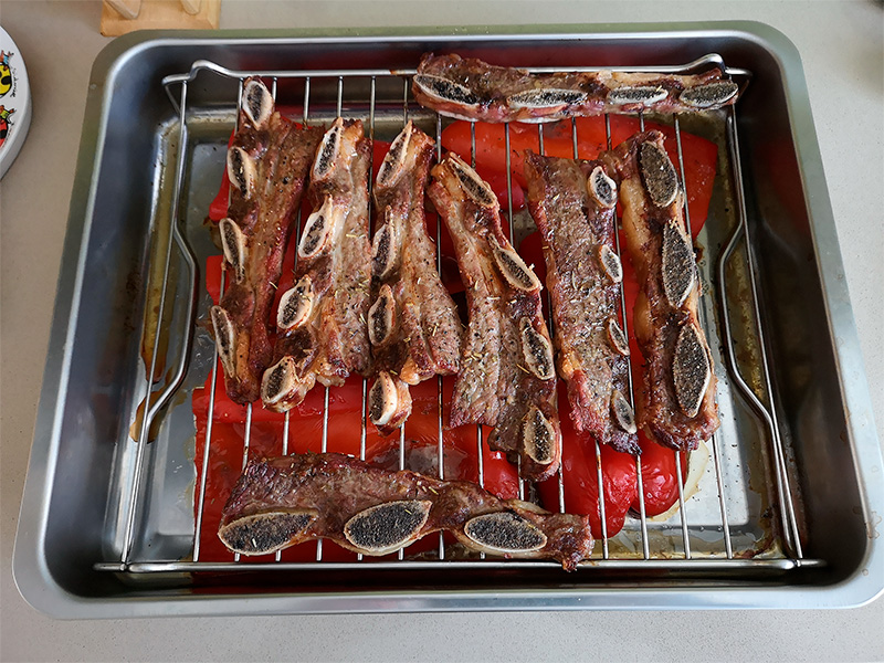 Ну и все, можно доставать. Ребрышки достаточно мягкие, при этом упругие (в фольге они иногда становятся чересчур мягкими и расползающимися), перцы - вообще отличные, намного вкуснее, чем просто запекать.
