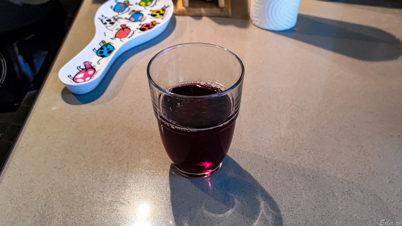 Берем стакан, наливаем туда примерно на треть красного вина (разумеется, лучше использовать самую дешевку; я использую для готовки евровый Don Simon в пакетике - в России это вино тоже продается, но тут на самом деле вообще без разницы, какое, лишь бы дешевое красное сухое) и доливаем до половины стакана водой. Выливаем в емкость.