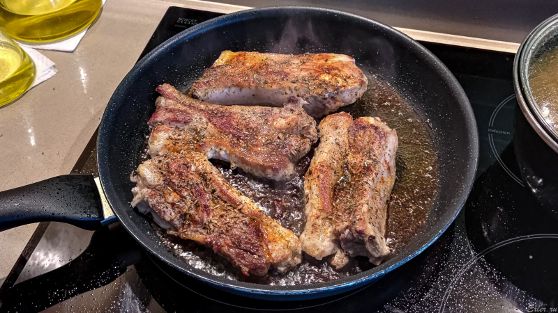 Обжариваем куски в оливковом масле до получения корочки - примерно по пять минут на стороне на разогретой сковородке. В масло при обжарке кинуть пару раздавленных долек чеснока, которые следует убрать, когда они станут золотистыми.