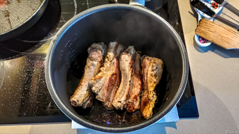 После того как ребра обжарились, кладем их в емкость мультиварки (как вариант - в кастрюльку или глубокую сковородку), туда выливаем масло со специями из сковородки.