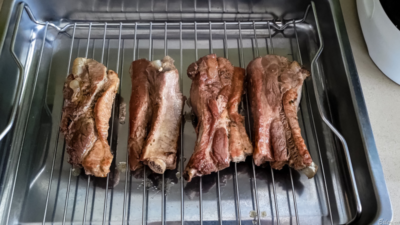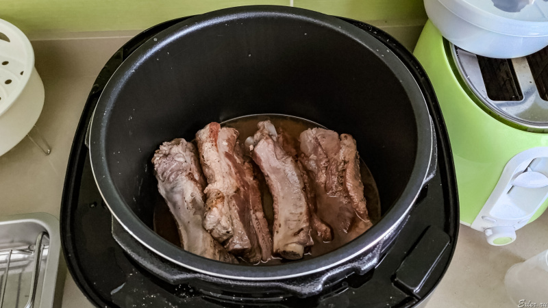 А нам уже пора доставать ребрышки, звоночек прозвенел. Кстати, производитель этой мультиварки рекомендует после тушения дать еще постоять продукту, чтобы давление пара ослабло естественным путем (это минут пятнадцать), но я не вижу в этом никакого смысла: в данном случае ребрышки уже идеальной консистенции, поэтому я просто стравливаю пар через клапан.