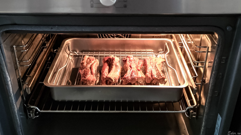 И ставим в духовку на 10 минут на 200 градусов, верхний и нижний нагрев. В случае рубленых ребрышек 10 минут будет многовато, лучше поставить минут на 5-7.