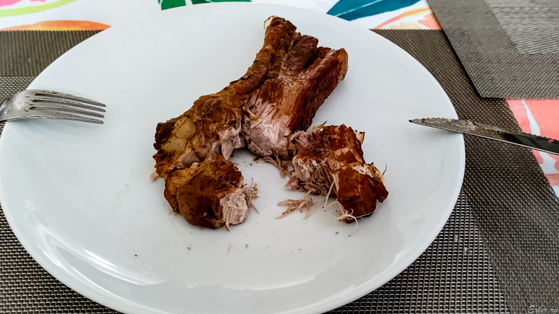 И теперь пробуем... Эступендо! Лучшие ребрышки, что я вообще когда-нибудь ел: нежнейшие, вкуснейшие! Тут, конечно, их можно также помазать горчичкой или каким-то соусом, но как по мне - ничего не нужно, и так шикарно!