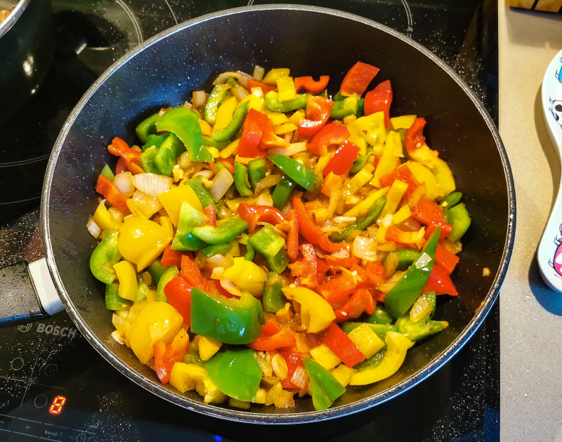 Берем несколько больших перцев (лучше всего - штук шесть, но у меня столько не было), режем, кидаем в лук и также обжариваем минут десять-пятнадцать. Это все хорошенько солим, перчим, добавляем специи по вкусу: я туда кладу еще прованские травы и хмели-сунели.