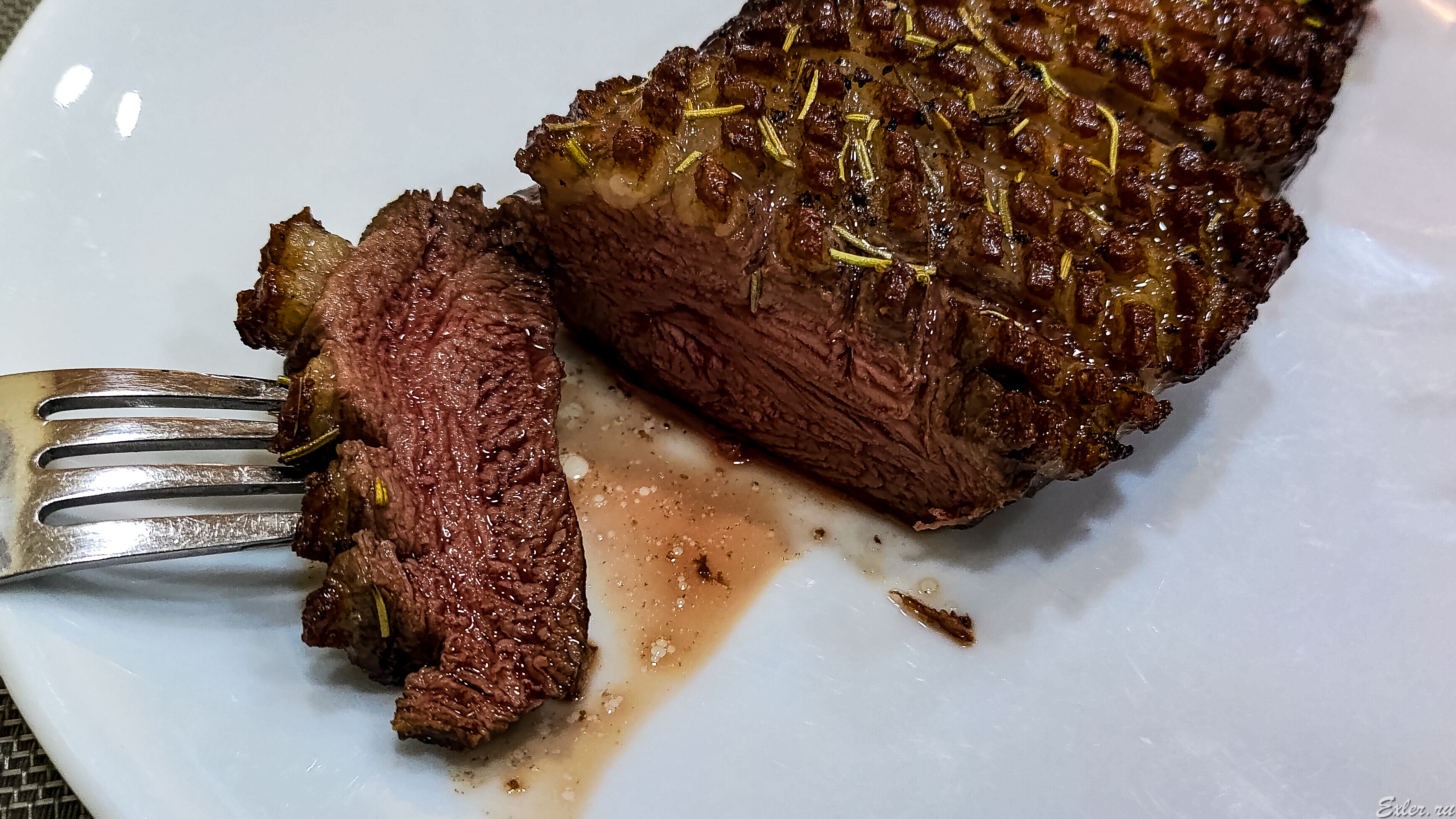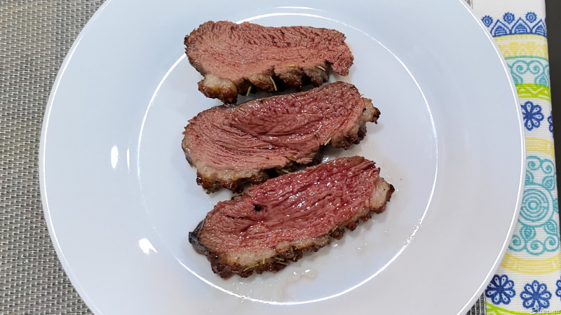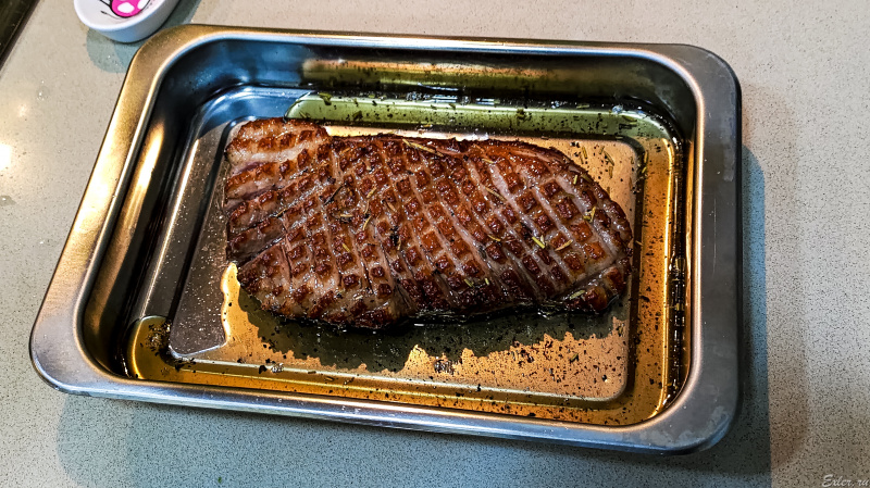 2-3 часа выдерживаю в су-виде, затем, буквально на одну минуту с каждой стороны кидаю на раскалённую сковородку. Получается отлично просто. Можно готовить куски любой толщины.
