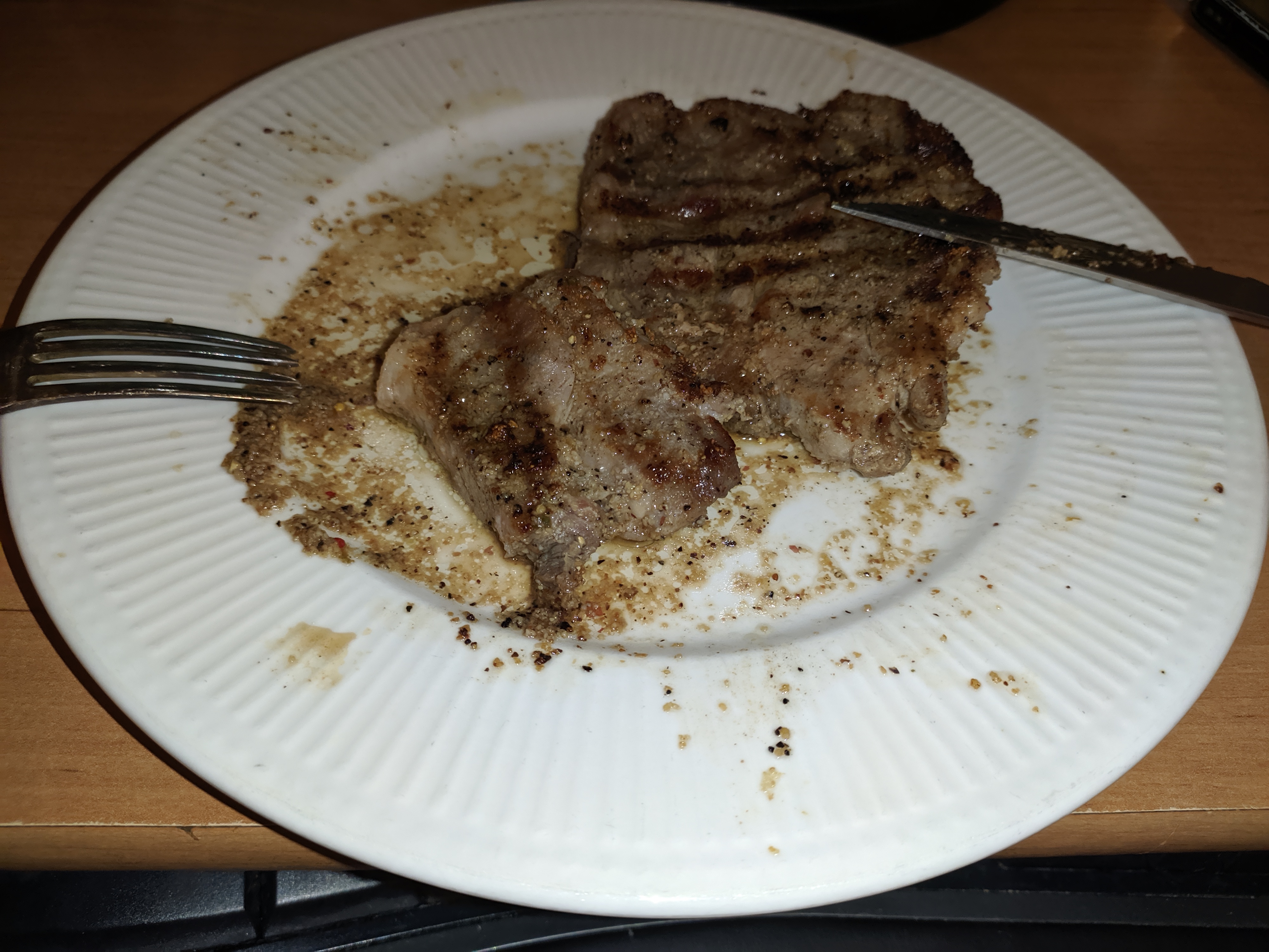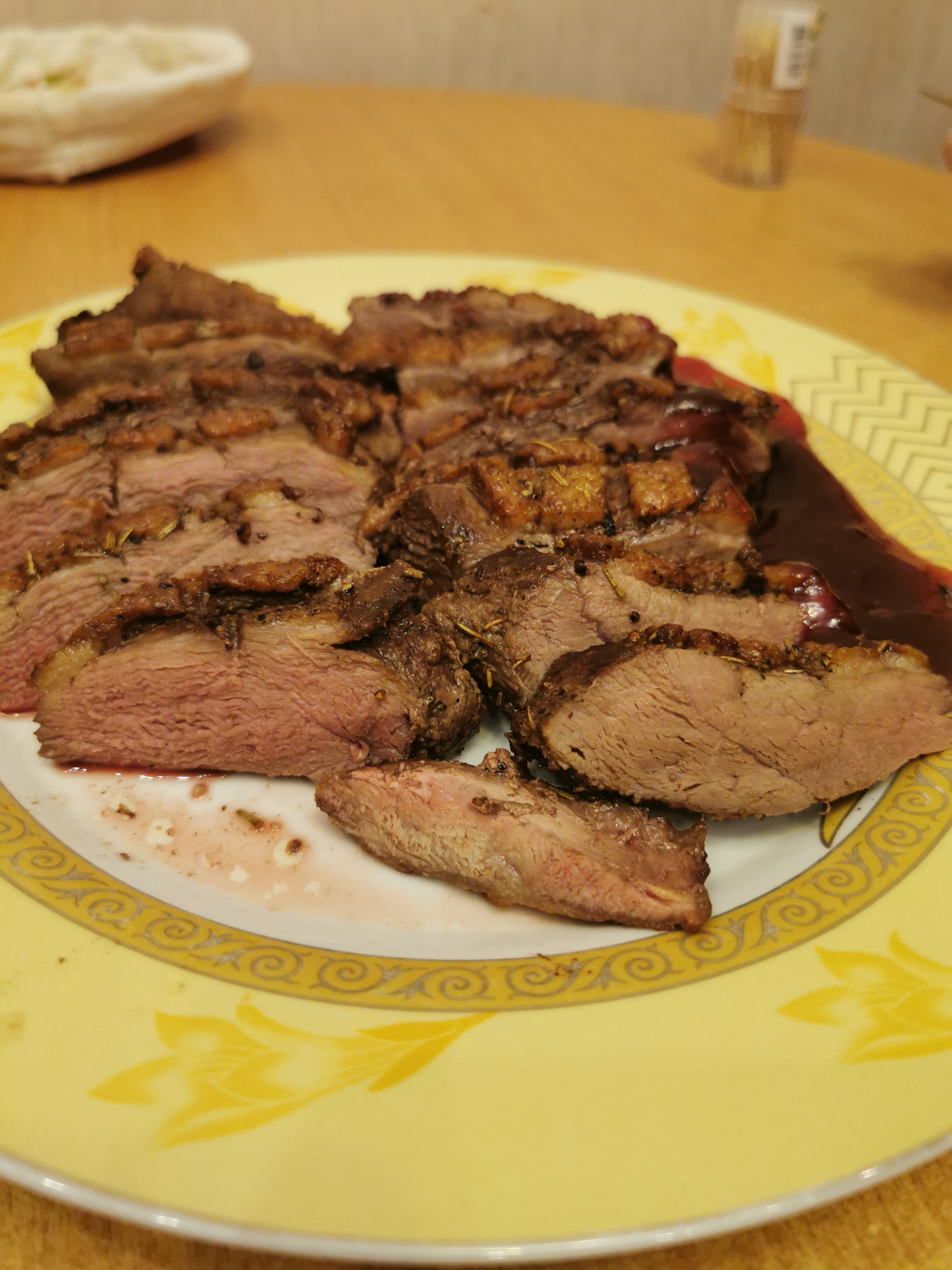 Идеальная прожарка! Грудка сочная, нежная - один в один как в одном очень крутом ресторане, где эта грудка - фирменное блюдо. Там четыре кусочка стоили €22. Здесь мне вся грудка (две немаленьких порции) обошлась в €6 с чем-то. Да, конечно, у меня в комплект блюда не входит чайная ложечка картофельного пюре, несколько хворостинок картошки-фри, одна малюсенька помидорка и две верхушки отваренной спаржи (все это было в качестве гарнира к грудке в ресторане). Но тем не менее.