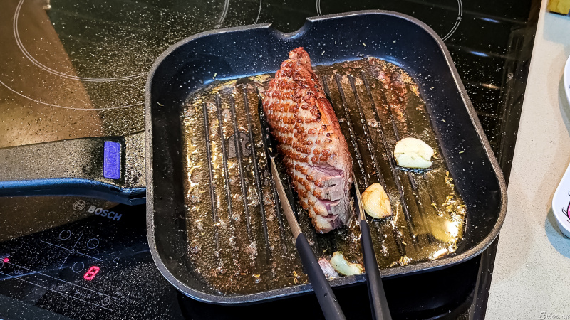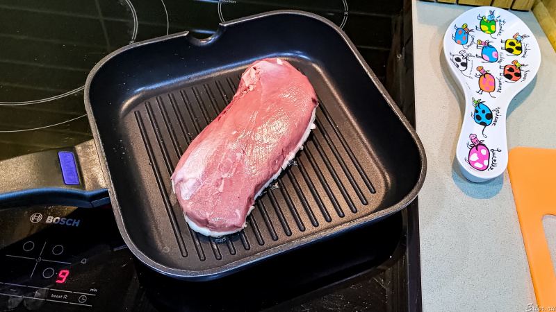 Грудку нужно обжарить с каждой стороны на большом огне где-то по минуте - "запечатать". Хорошо бы также ее подобным образом обжарить с боков - держа щипцами.