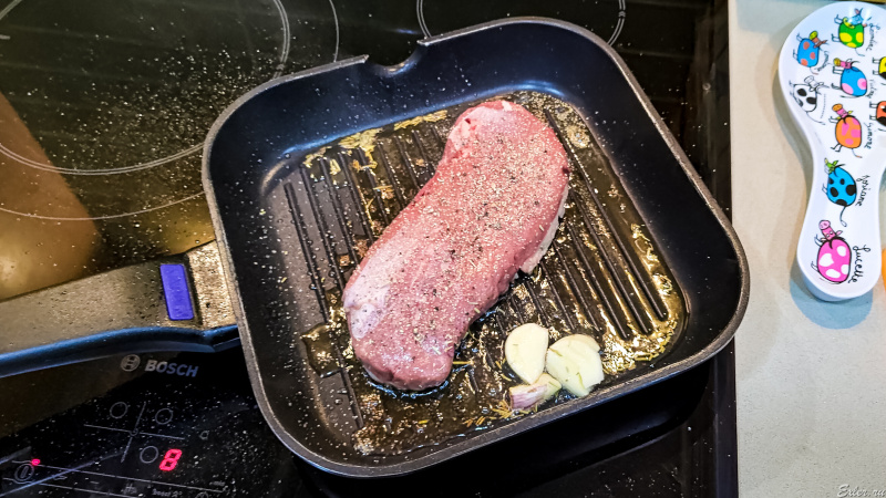 Ставим духовку прогреваться при 180 градусах. Ставим прогреваться теплоемкую сковороду: чугунную (у кого она есть) или толстостенную сковороду для стейков (я использую именно такую).