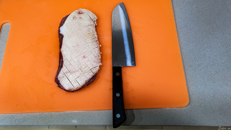 У грудки острым ножом нужно сделать насечки на шкурке в виде ромбиков: для этого сначала делаем параллельные насечки под углом, затем грудку поворачиваем на 90 градусов по горизонтали и снова повторяем данную процедуру.