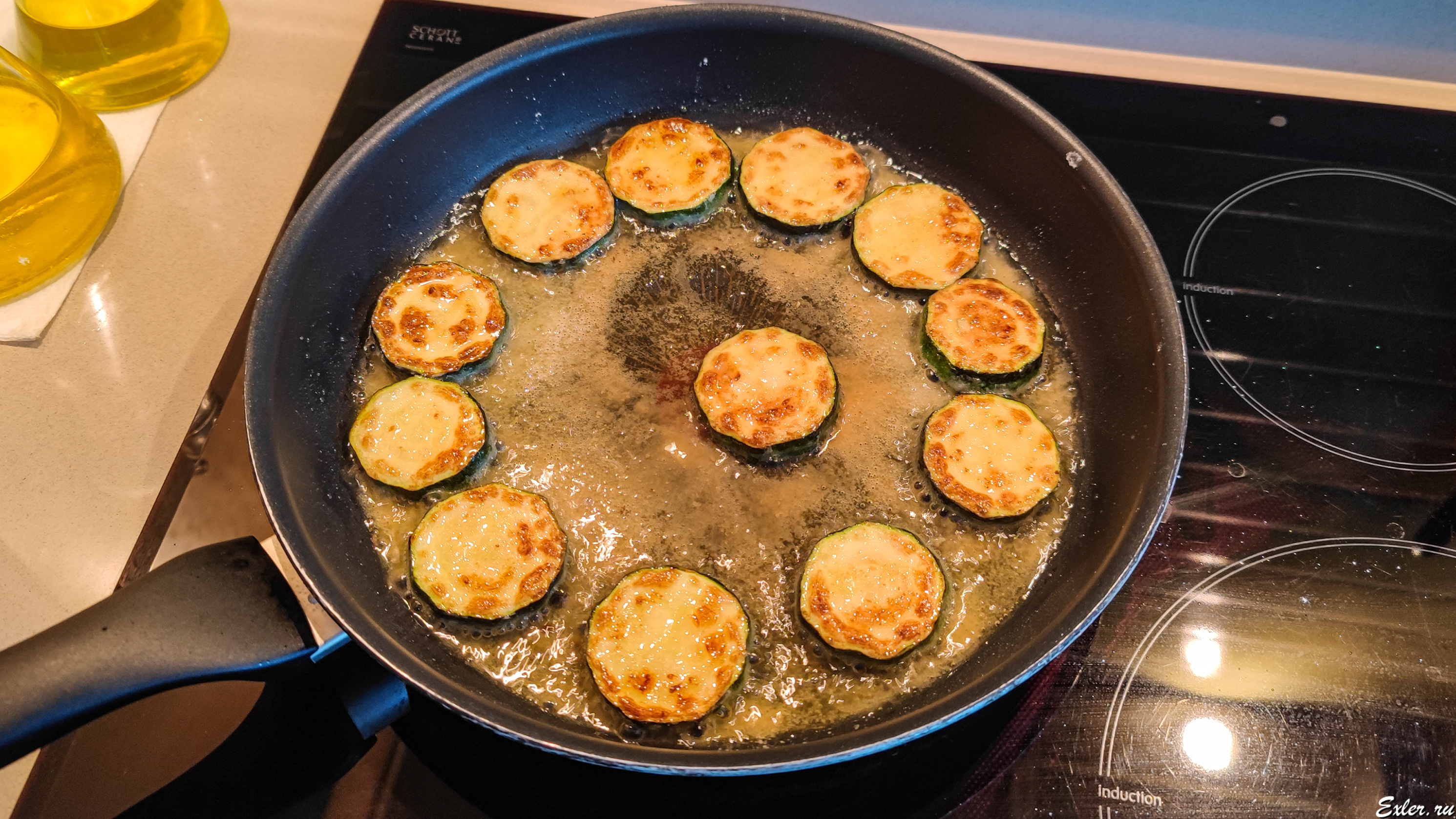 Кабачок нужно порезать на кругляшки (мы настаиваем, что это должны быть кругляшки, а не эллипсы, которые недопустимы). Толщина кусочков - не более 7-8 миллиметров, потому что если они будут слишком толстые, то нормально не прожарятся - это вам, извините, не двухсантиметровый стейк.