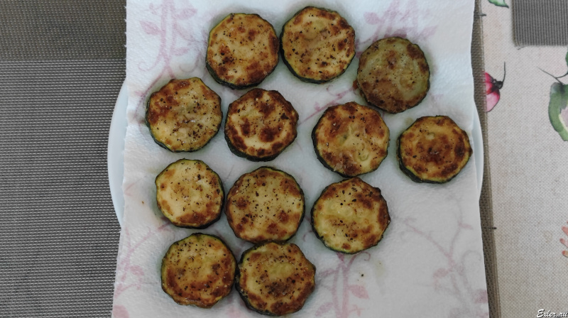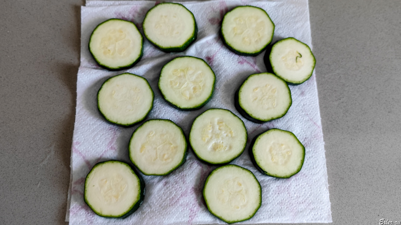 Итак, кабачок. Кругляшки нужно вытащить из миски и промакнуть бумажным полотенцем: чем меньше влаги на них будет, тем лучше и быстрее они пожарятся.