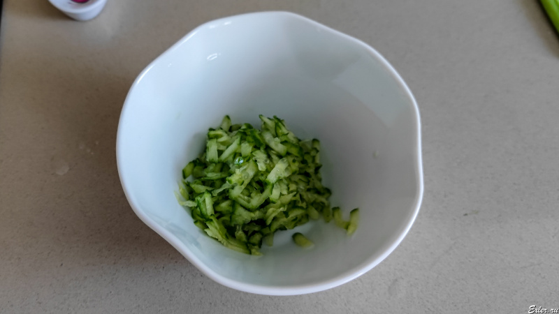 Берем небольшой огурец, натираем его на крупной терке, сливаем лишний сок (лучше не просто слить, а отжать огурец, так как в нем много влаги).
