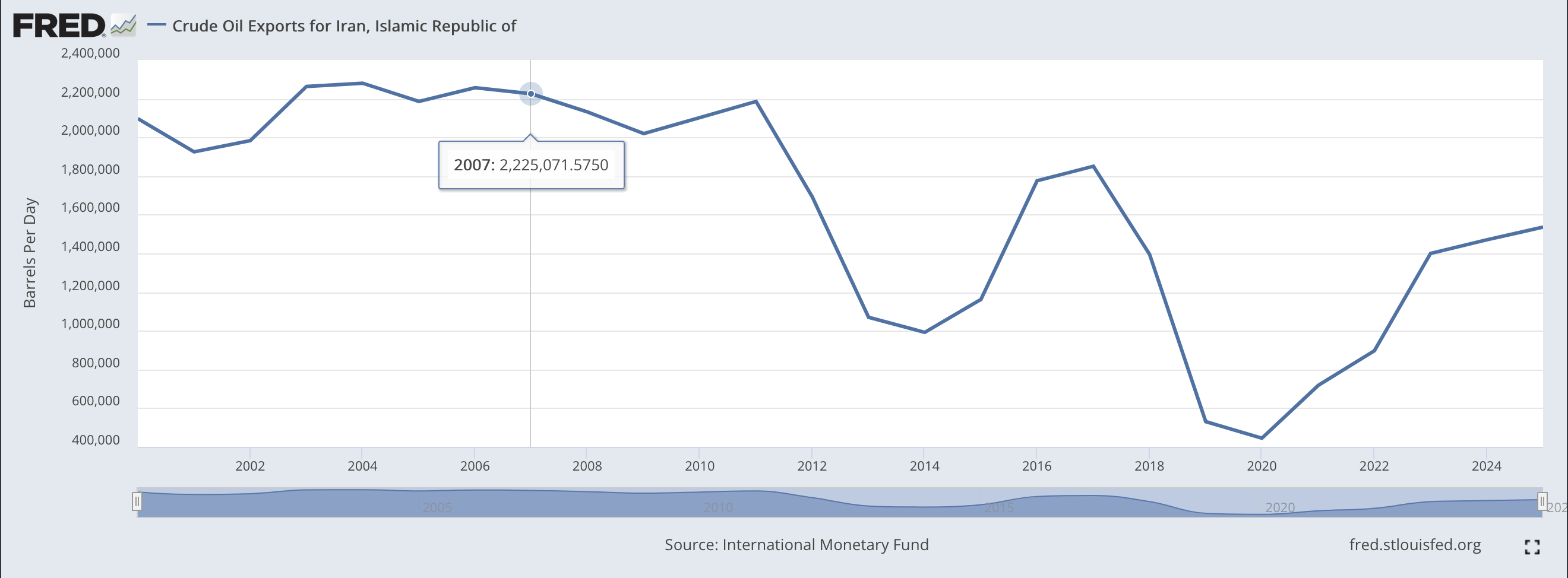 Насчёт экспорта нефти из Ирана. Снижение экспорта в 2018 — эффект от отмены ядерного соглашения; поменяли продажи нефти на ядрёну бонбу. Рекордно низкие цифры в 2020 — к гадалке не ходи, эффект от ковида. Предыдущий провал, в 2012-2016 — санкции, введённые Обамой.