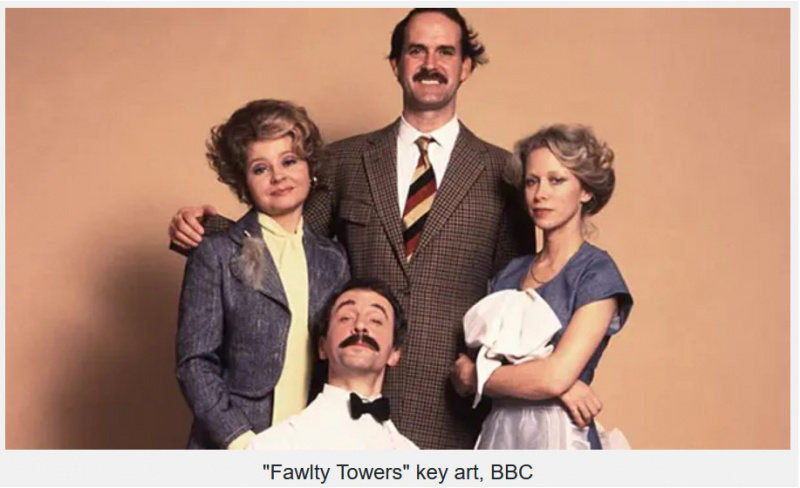 Кстати, оказывается - вычитал в этой заметке - что на создание оригинального сериала Клиза вдохновило пребывание в отеле одного британского приморского городка во время съемок "Монти Пайтонов". Там был ужасно грубый менеджер, и Клиз решил его высмеять. Правда, как это обычно бывает, литературный персонаж зажил своей собственной жизнью, и Бэзил Фолти - не сказать что слишком грубый. Своеобразный, да, но не грубый. А уж их парочка с Сибилл (Прунелла Скейлз), а также фееричный каталонец "Легче выдрессировать обезьянку" Мануэль (Эндрю Сакс) - это что-то с чем-то!