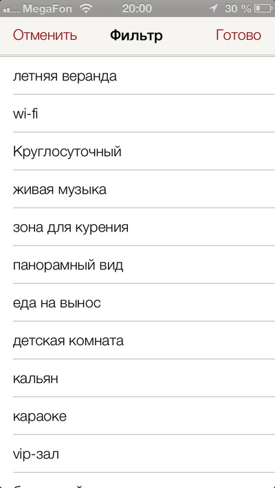 Приложение «Ябыпоел» позволяет сортировать список ресторанов и кафе по самым разным критериям: от самых очевидных, вроде "тип кухни" или "наличие Wi-Fi", до весьма специфических - например, "наличие детской комнаты". Это может оказаться удобным: если, например, вам надо провести банкет – включаете соответствующий фильтр, и видите только заведения с банкетным залом.