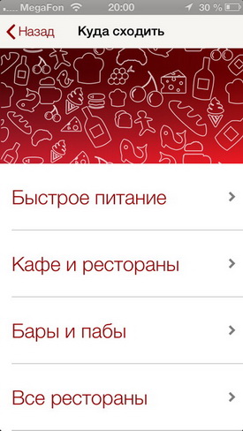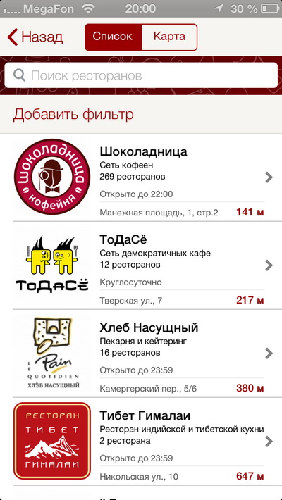 Очень удобно наличие геолокации. Встроенный в телефон приемник GPS определяет, где вы сейчас находитесь, и список заведений сортируется "от ближних к дальним", при этом попутно указываются расстояния до них. Если же, скажем, вы планируете ужин на вечер в ресторанчике рядом с домом, а сейчас находитесь на работе – можете указать это и поиск будет проводиться уже от домашнего адреса.