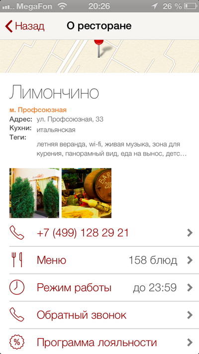 Помимо меню есть вся необходимая информация о самих ресторанах: время работы, фото интерьера, телефон, адрес, схема проезда. Одним нажатием на кнопку можно забронировать столик или заказать «обратный звонок» администратора, если вам надо поговорить «вживую», а дозвониться не удалось.